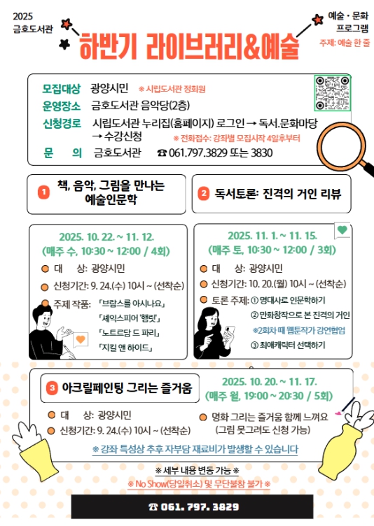 김현숙 도서관과장은 “하반기에는 청·장년층 시민들이 도서관을 더욱 가까이 느끼고 자주 찾게 되길 바란다”며 “예술과 지식의 융합으로 다채로운 문화 경험을 제공하겠다”고 말했다.