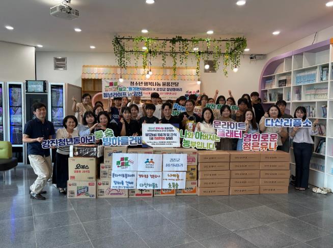 ![]() 청년동아리 대표들이 청소년들에게 나눔물품을 전달하고 있다. |
