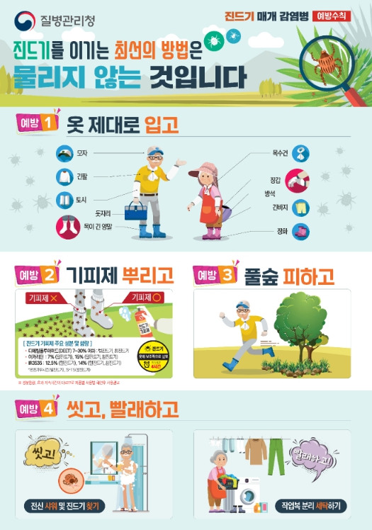 이를 위해 ▲야외활동 전 모자·긴팔·긴바지·등산화·목수건·장갑·긴 양말 착용으로 피부 노출 최소화 ▲진드기 기피제 사용 ▲야외에서는 돗자리를 깔고 앉기 ▲활동 후 옷과 몸을 털고, 씻고, 세탁하기 등의 예방수칙을 준수해야 한다.