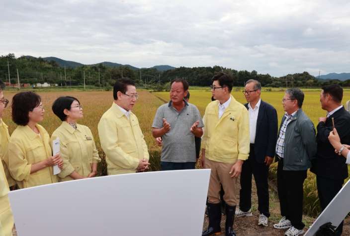 ![]() 김철우 보성군수·김영록 전남도지사, 벼 깨씨무늬병 피해 현장 점검_미력면 피해 현장에서 김철우 보성군수(오른쪽)와 김영록 전라남도지사(왼쪽)가 벼 깨씨무늬병 병해를 점검하고 있다. |