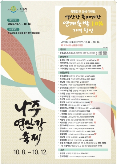 ![]() 나주시가 ‘2025 나주영산강축제’를 맞아 지역 숙박업소와 함께 특별할인 상생 이벤트를 진행한다 |