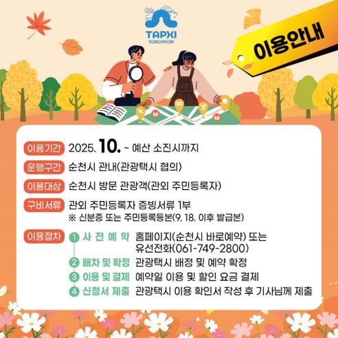 ![]() 순천시, 관광택시 반값 할인으로 가을 여행객 맞이 |