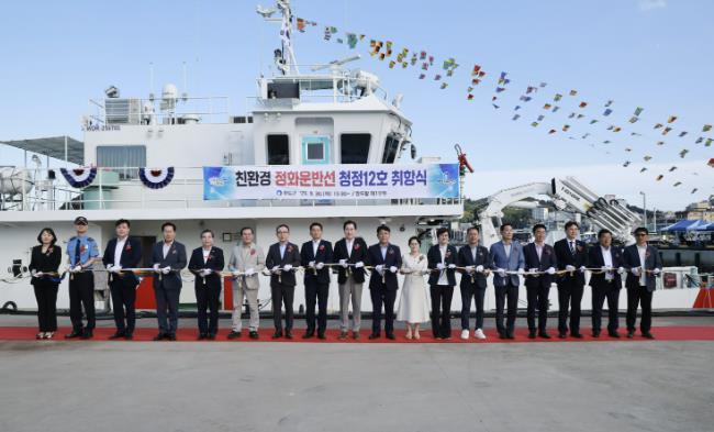 ‘청정 12호’는 124톤, 적재 중량 30톤 규모의 친환경 하이브리드 엔진을 탑재해 대기오염 저감 효과와 특히 크레인과 부속선을 갖춰 상·하역이 가능하도록 설계돼 해양 쓰레기 수거 작업에 도움이 될 것으로 기대된다.