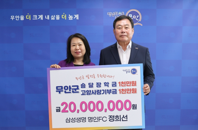 김산 군수는 “매년 꾸준히 지역사회를 위해 기탁해 주심이 쉽지 않음에도 정희선 FC께서 보여주신 진정성이 ‘명인’이라는 타이틀을 얻게 해 준 것이 아닐까 싶다”며, “기탁금은 학생들의 학업 지원과 지역 발전을 위해 소중히 쓰겠다”고 전했다.
