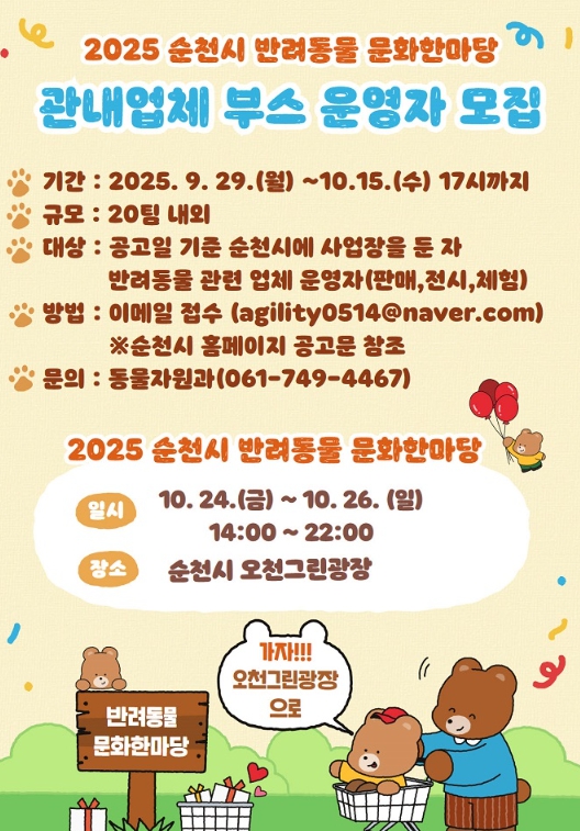 ![]() 순천 반려동물 문화한마당, 참여 부스 운영자 모집 |