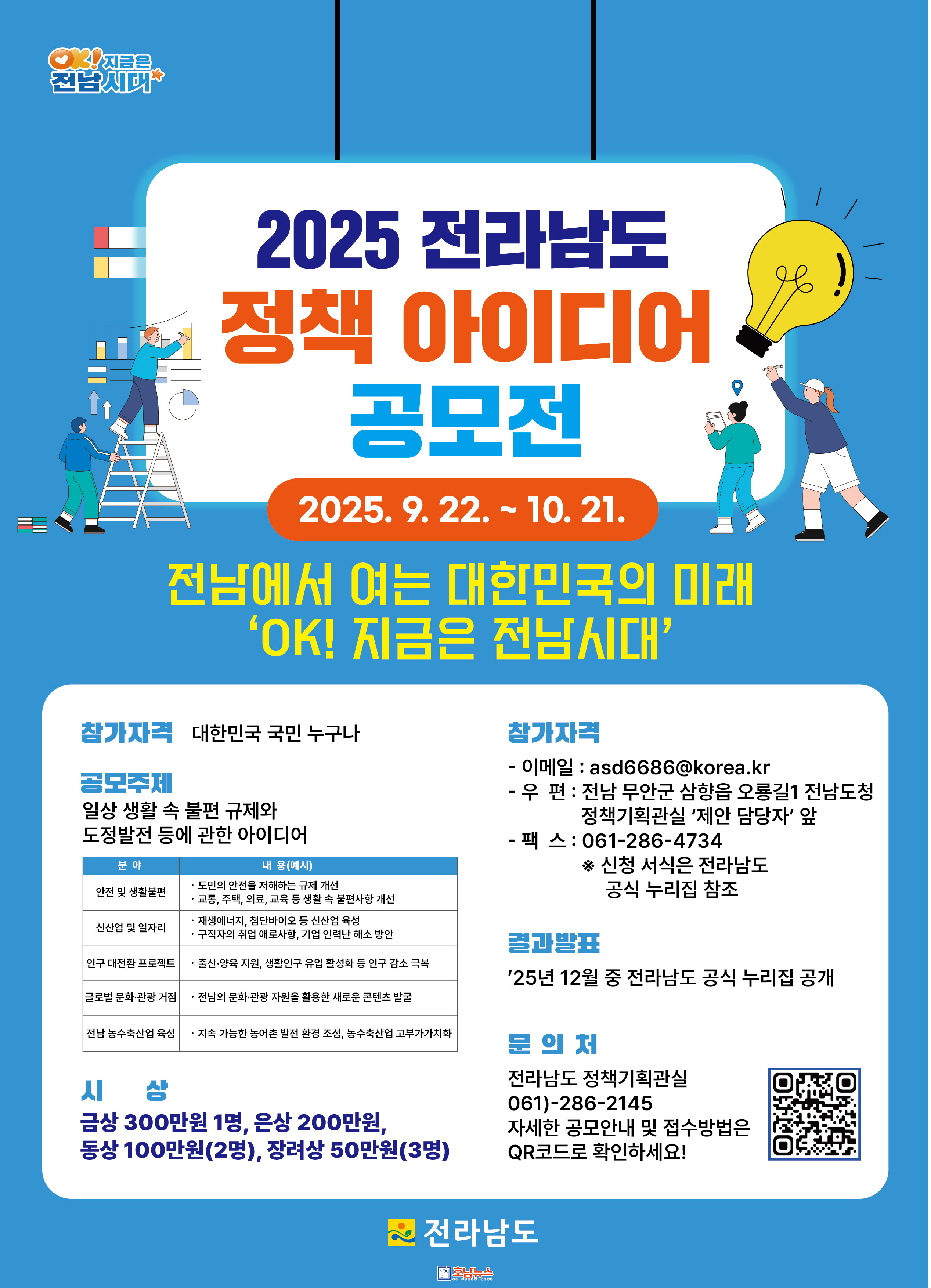 도는 ‘생활 속 불편을 해소하고, 지역의 미래를 책임질 아이디어’를 주제로 ‘2025 전라남도 정책 아이디어 공모전’을 개최한다고 밝혔다.