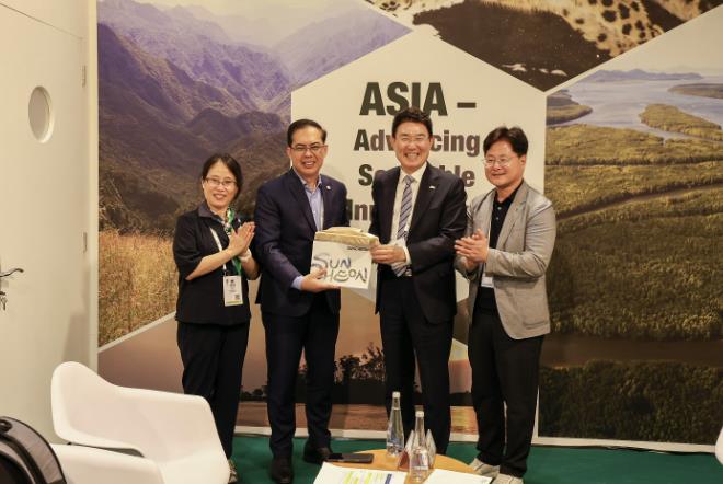 ![]() 지난 9일 아랍에미리트 아부다비에서 노관규 순천시장이 딘도 캄필란(Dindo Campilan) IUCN 아시아지역책임자와 양자회담을 갖고 기념사진을 촬영하고 있다 |