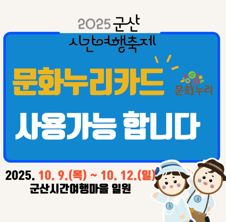 김형옥 문화예술과장은 “통합문화이용권은 생활 속에서 문화를 누릴 수 있는 유용한 복지 제도.”라며 “군산시간여행축제 현장에서 통합문화이용권을 적극 활용해 풍성한 축제와 다양한 체험을 즐기길 바란다.”라고 말했다.