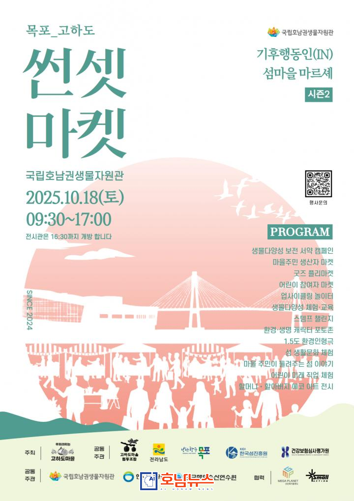 기후에너지환경부 산하 국립호남권생물자원관(관장 박진영)은 오는 10월 18일(금) 오전 9시 30분부터 오후 5시까지, 목포시 고하도 야외정원에서 섬마을 주민들과 8개 기관이 함께하는 ‘2025년 기후행동인(IN) 고하도 썬셋 마켓’을 개최한다고 밝혔다.