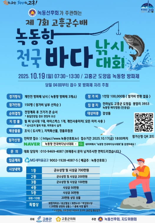 고흥군과 고흥군의회가 주최하고 녹동선후회가 주관하는 이번 대회는 녹동항과 소록도 인근 방파제 등 3개소에서 감성돔을 대상어종으로 진행된다.