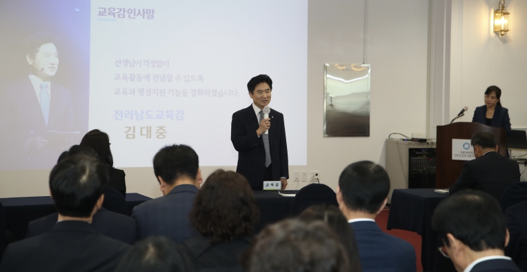![]() 김대중 전라남도교육감이 14일 목포에서 열린 ‘10월 정책협의회’에 앞서 인사말을 전하고 있다. |
