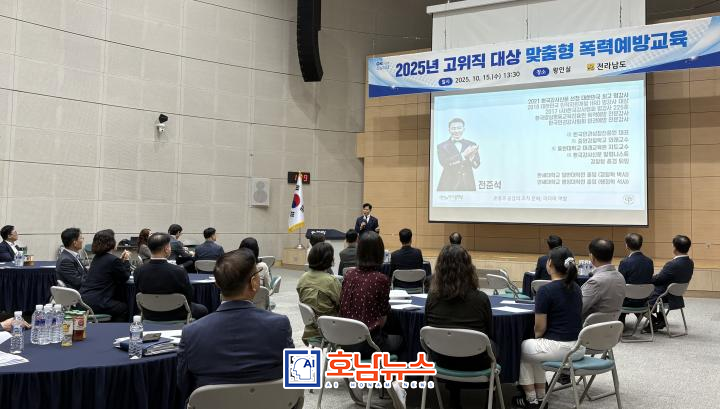 On October 15, Jeonnam Province held a customized training session on the four major types of violence—sexual harassment, prostitution, sexual violence, and domestic violence—for senior officials, including Deputy Governor Kang Wi-yeon and heads of departments, at the Wangin Room of the provincial office.