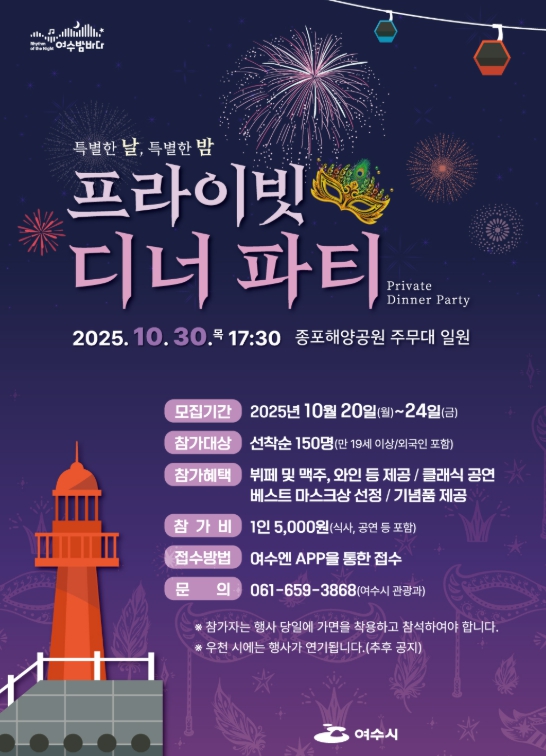 시 관계자는 “작년에 이어 올해도 이색적인 장소에서 시민과 관광객이 함께 낭만 밤바다를 즐길 수 있도록 프라이빗 디너 파티를 준비했다”며 “선선한 가을밤 여수의 매력과 낭만을 즐길 수 있는 이번 행사에 많은 관심과 참여를 바란다”고 전했다.