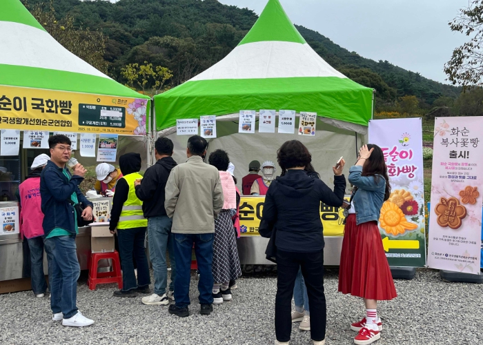![]() 2025 화순고인돌가을꽃축제 현장에서 ‘복사꽃빵’을 홍보·판매 중인 한국생활개선화순군연합회 회원들 모습. |