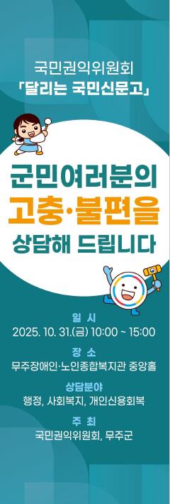 당일 오전 10시부터 오후 3시까지 국민권익위원회 조사관과 한국사회복지협의회, 신용회복위원회 등 협업 기관의 전문 상담 인력이 무주읍 소재 무주상상반디숲 다목적실에서 무주군민들과 만날 예정이다.
