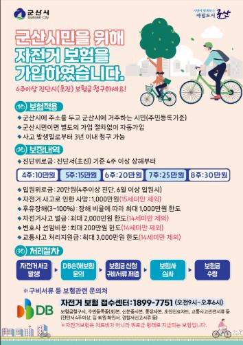 11월 1일부터 갱신된 군산시민 자전거 보험은 군산시에 주민등록을 둔 시민(외국인 포함)이라면 누구나 보장받을 수 있으며, 군산시가 보험료 전액을 부담한다.