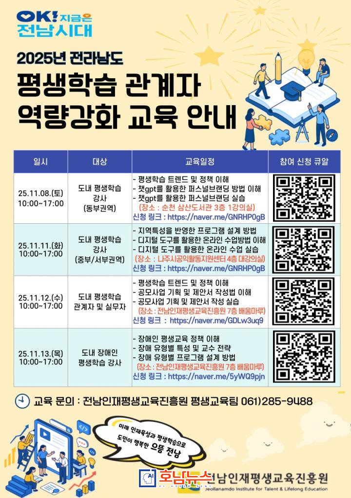 The Jeonnam Talent Lifelong Education Institute (Director Beom Hee-seung) announced that it is recruiting participants for the 2025 Jeonnam Lifelong Learning Stakeholders Capacity-Building Program until November 7, aimed at improving the professionalism and on-site response capabilities of lifelong learning practitioners.