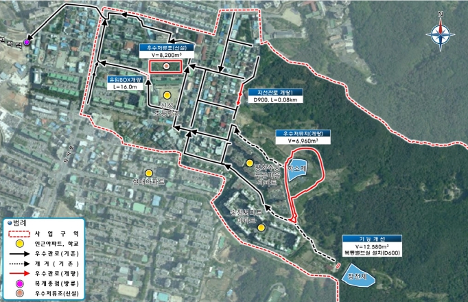 해당 지역은 지난 2020년 8월 8일 내린 시간당 최대 35.1mm의 집중호우로 인해 2.0㏊의 면적과 주택 7동의 침수피해가 발생한 지역으로, 시는 반복적인 피해를 예방하기 위해 지난 2021년 행정안전부의 ‘우수유출저감시설 설치 공모사업’에 신청해 이듬해 신규 사업지구에 선정됐다.