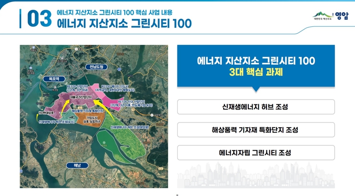 영암군은 대한민국 에너지 대전환을 선도하는 ‘에너지 지산지소 그린시티 100’ 정책을 추진 중이다.