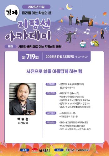 한편, 지평선아카데미 강연은 누구나 참석 가능하며, 현장 참여가 어려운 시민을 위해 경로당 IPTV를 통해 강연 영상이 실시간 송출되고, 강연 후에는 강사 동의하에 김제시 사이버학습센터에 영상을 업로드해 제공한다.