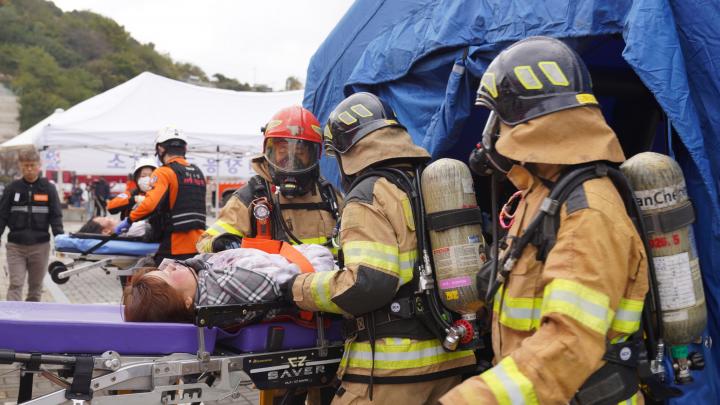 Hosted by the Jeonnam Fire Headquarters and supervised by the National Fire Agency, the drill unfolded in a highly realistic manner, assuming simultaneous emergencies such as building collapses, the failure of Geobukseon Bridge, ship fires, and wildfires triggered by the earthquake.