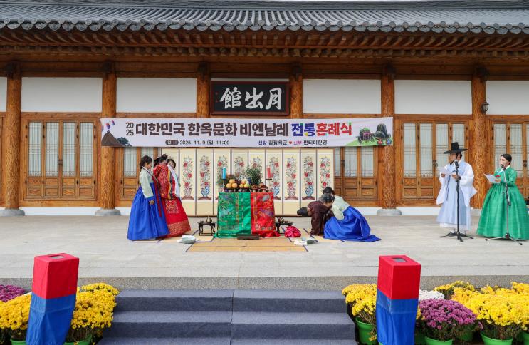 9일 영암목재문화체험장에서 ‘2025 대한민국 한옥문화 비엔날레’ 행사의 하나로 전통혼례식이 진행됐다.