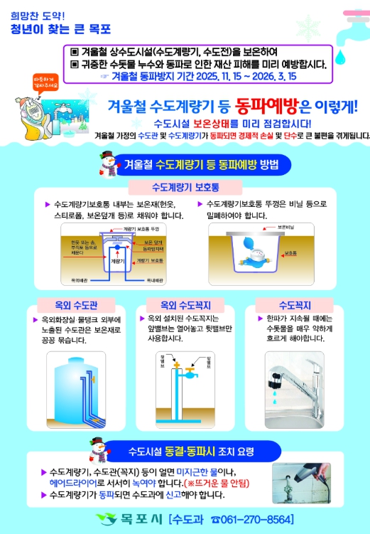 수도관이 얼거나 파손될 경우 목포시청 수도과로 연락하면 신속한 조치를 받을 수 있다.