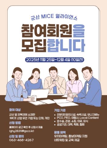 ![]() 2025 군산 MICE 얼라이언스(GMA) 신규 회원 모집 |