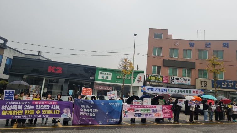 여성폭력 추방주간(11.25.~12.1)은 여성·아동에 대한 폭력을 예방하고 젠더폭력으로부터 안전한 사회 환경을 조성하기 위해 추진됐으며 성폭력상담소, 김제시가족센터, 김제시청소년상담복지센터, 김제시 여성단체협의회, 여성친화도시시민참여단, 어린이집연합회, 지역아동센터협의회 등 민·관 40여명이 합동으로 캠페인을 전개했다.