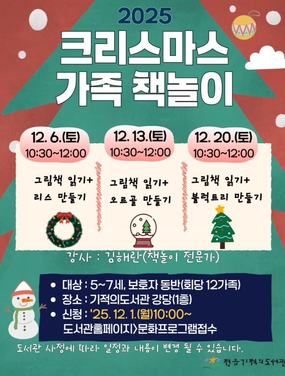 이 시간에는 참여 가족들이 성탄절을 주제로 한 그림책을 함께 읽고 이야기를 나눈 뒤, 크리스마스 리스(장식용 화환)나 오르골, 블록 트리 등 연말 분위기가 물씬 풍기는 소품을 직접 만들어보는 창작 활동을 즐길 수 있다.