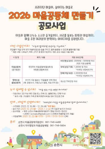 ![]() 순천시, 2026년 ‘마을공동체 만들기’ 공모사업 참여 공동체 모집 |