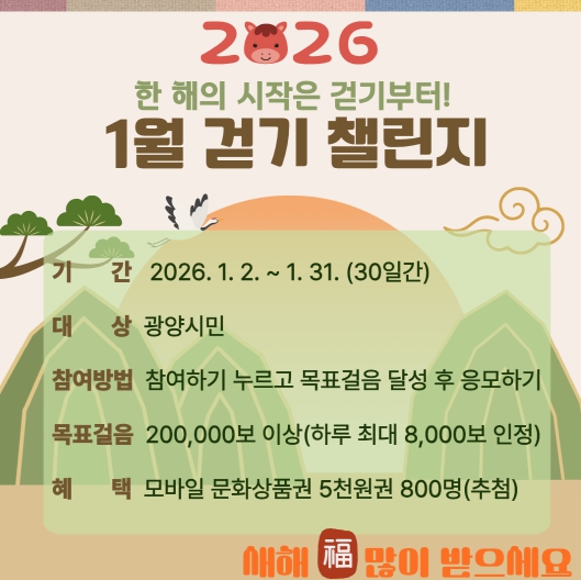 ![]() 광양시, 워크온 ‘한 해의 시작은 걷기부터! 1월 걷기 챌린지’ 운영 |