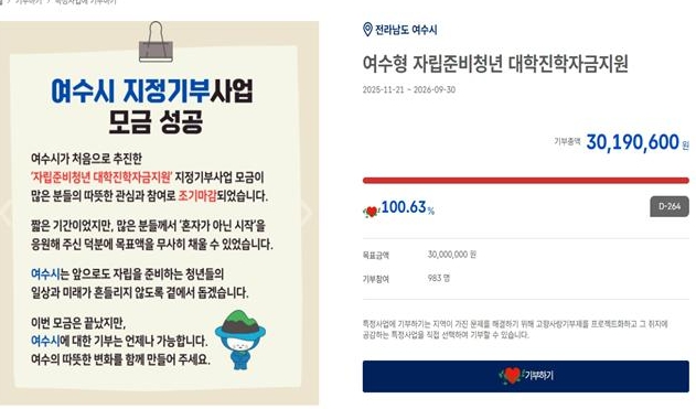 시 관계자는 “여수 고향사랑기부제에 적극 참여해 준 모든 기부자분들께 깊이 감사드린다”라며, “세제 혜택이 더욱 확대되는 만큼, 앞으로도 많은 분들이 여수시와 소중한 인연을 맺고 지역 발전에 동참할 수 있도록 매력적인 답례품과 기부자가 공감하는 기금 사업을 지속적으로 발굴해나가겠다”라고 밝혔다.
