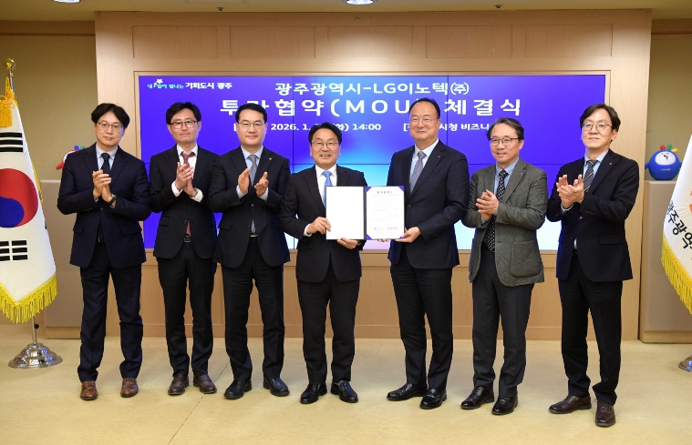 이날 협약식에는 강기정 시장과 김영문 문화경제부시장, 손두영 인공지능산업실장, LG이노텍 문혁수 대표이사 사장과 유병국 모빌리티솔루션사업부장 전무, 조백수 경영지원담당 상무 등이 참석했다.