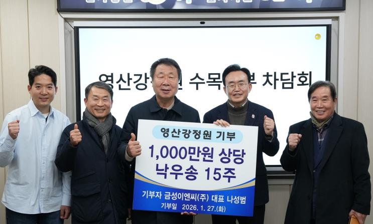 세지면이 고향인 나성범 대표는 2024년 자연석 432톤(2천만 원 상당)을 기부한 데 이어 올해에는 1천만 원 상당의 수목을 추가로 기부하며 영산강정원 조성에 꾸준한 관심과 지원을 이어오고 있다.