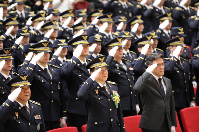 ![]() 신임경찰 졸업식에 앞서 국기에 대한 경례를 하는 해양경찰청장 직무대행 장인식 치안정감 |