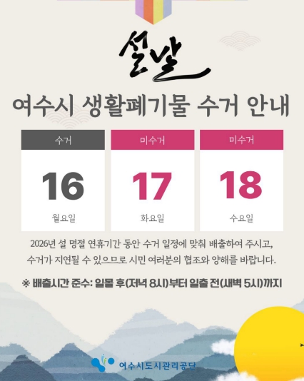 ![]() 여수시도시관리공단, 2026년 설 명절 대비 특별 환경정비 추진 및 휴무 안내 |