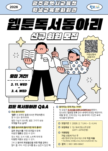 ![]() 광주학생교육문화회관, 트윈세대 ‘웹툰 독서동아리’ 모집 |