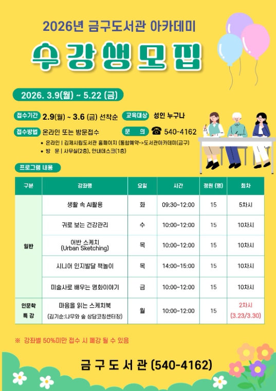 ![]() 김제시 2026년 금구도서관 아카데미 수강생 모집 |