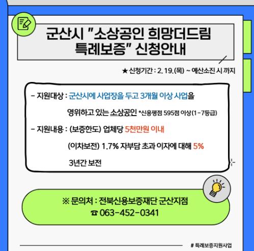 ![]() 군산시, ‘소상공인 희망더드림 특례보증’ 시행 |