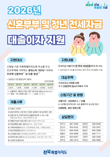 전북자치도는 지난 16년간 5,714가구에 총 491억 원을 지원해 왔으며, 올해는 지원 규모를 더욱 확대해 저소득층과 청년, 신혼부부의 주거 안정에 실질적인 도움을 줄 계획이다.