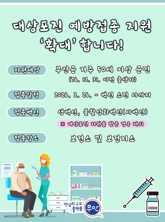 주민등록상 1년 이상 무안군에 거주한 50세 이상 군민이라면 지원가능하며 보건소 및 보건지소에서 접종할 경우 1회에 한해 백신비의 50%를 지원한다.