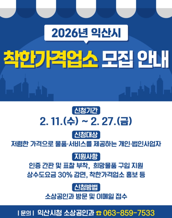 참여를 희망하는 업소는 익산시 소상공인과를 방문하거나 전자우편으로 신청하면 된다.