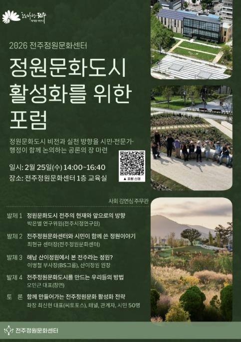 전주시 관계자는 “기후 위기와 정서적 고립이 깊어지는 시대에 이번 포럼을 통해 시민 삶의 질 향상을 위한 정원의 공공적 가치를 널리 알리고, 일상 속 정원 지향적 공간 활용을 지속해서 확대할 예정”이라고 말했다.