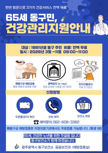 이번 사업은 65세를 단순한 ‘노인 연령’이 아니라 생애 주기에서 건강관리를 본격적으로 시작하는 출발점으로 인식하도록 돕기 위한 것으로, 각종 질환의 위험이 높아지는 시기에 예방접종과 검진을 함께 제공해 주민들이 자신의 건강 상태를 종합적으로 점검하고, 이후 지속적인 관리로 자연스럽게 이어지도록 하는 데 목적이 있다.