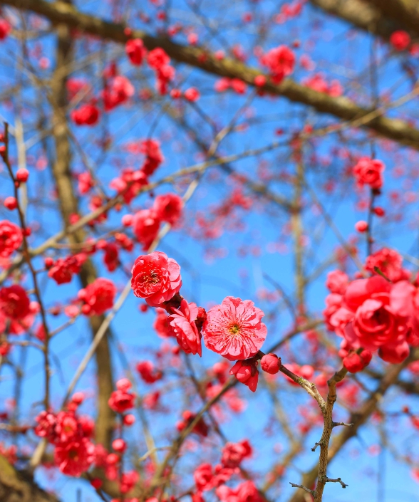 홍매화는 매년 2월 말부터 3월 초까지 절정을 이루며, 섬진강을 배경으로 공원 산책로와 어우러져 장관을 연출한다.