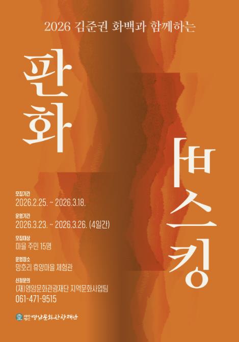 참가신청은 3월 20일까지 가능하며, (재)영암문화관광재단 지역문화사업팀을 통해 접수할 수 있다.