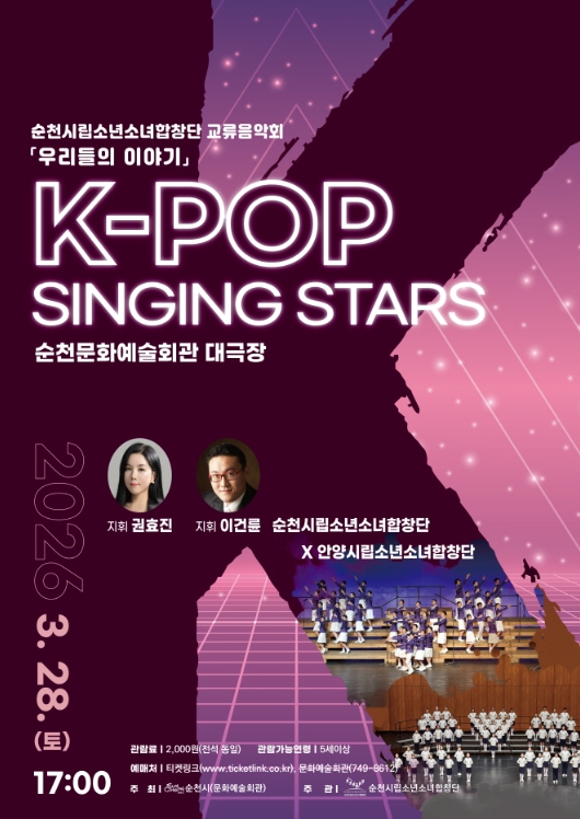 순천문화예술회관 관계자는 “이번 교류음악회는 지역 간 문화 교류를 통해 청소년들이 음악으로 소통하고 함께 성장하는 의미 있는 자리로 두 합창단이 만들어내는 아름다운 하모니 속에서 따뜻한 감동을 느끼길 바란다”고 말했다.