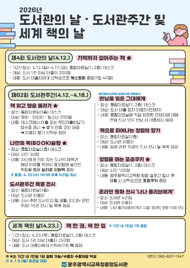 ![]() [포스터] 광주중앙도서관, 12~18일 ‘도서관주간’ 행사(본관 중앙도서관) |