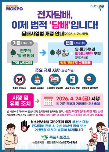 목포시보건소는 개정된 법령을 시민들에게 알리고 혼선을 최소화하기 위해 오는 4월 24일부터 5월 15일까지 3주간 집중 홍보 및 단속 기간을 운영할 계획이다.
